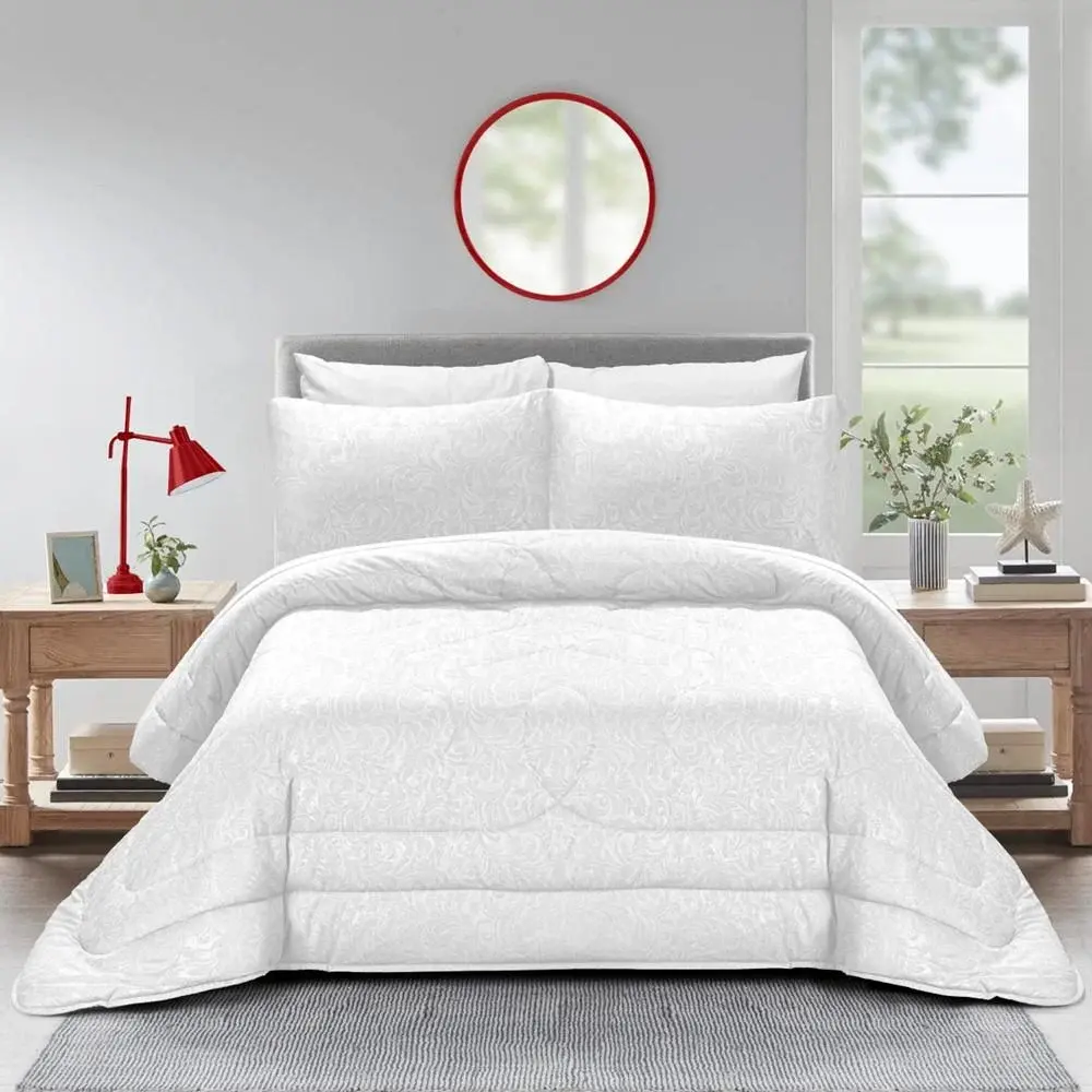 تمتعي بإطلالة أنيقة ولمسة راقية في غرفتك مع طقم لحاف أبيض روز فلوري. تصميم مشجّر ناعم بلمسات عصرية ووجه آخر سادة لخيارات متنوعة . مصنوع من خامات فاخرة تضمن لكِ الراحة التامة.