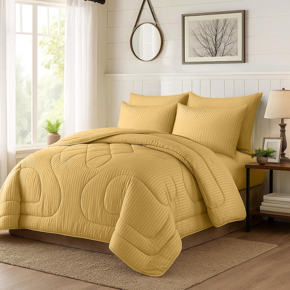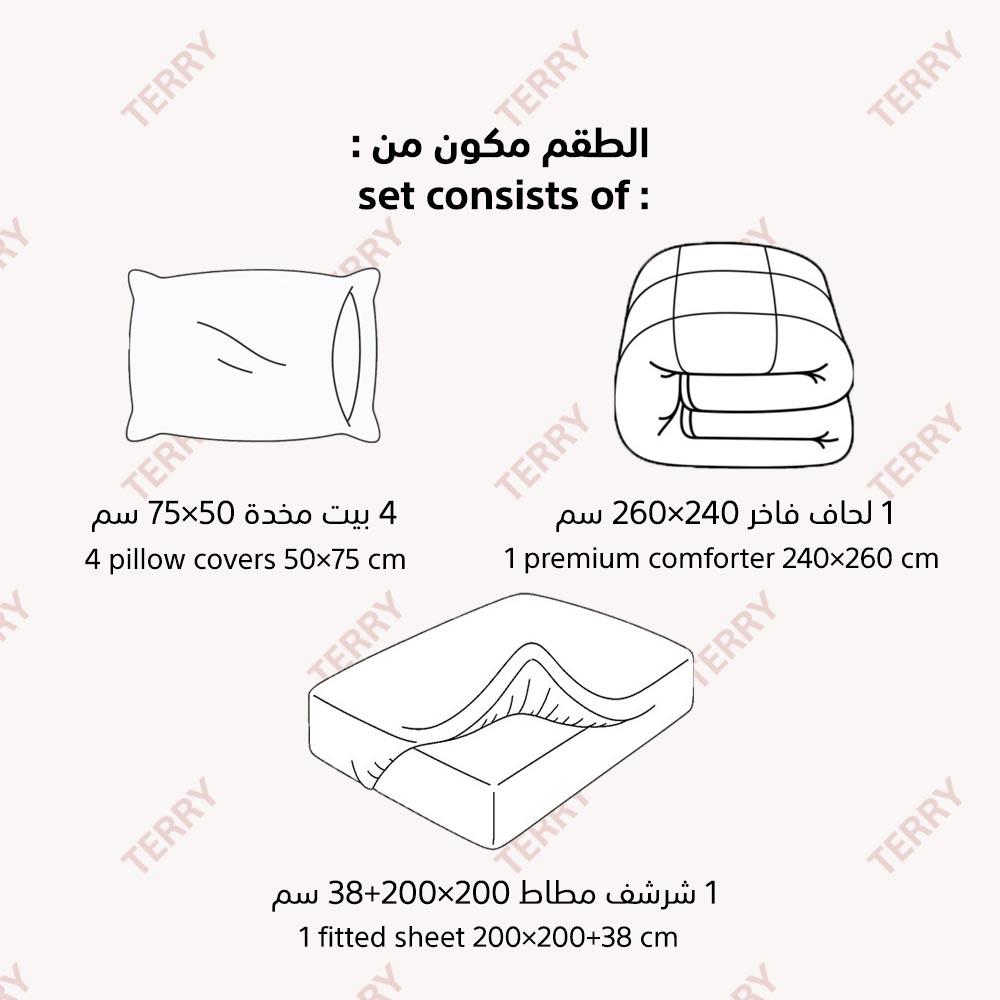 استمتعي بتجربة نوم فخمة مع مفرش فخم فندقى روز من تيري. هالطقم يجيب لك أجواء الفنادق الخمس نجوم لغرفتك، بتصميمه المقلم الراقي ولونه الجملي الهادي اللي يريح النظر. مصنوع من مايكروفايبر فاخر يشبه القطن الطبيعي، ويجي مع حشوة ثابتة تضمن لك دفء مثالي ونوم عميق. الطقم كامل ومتكامل، فيه كل شي تحتاجينه لسريرك من لحاف وشرشف مطاط و4 أغطية مخدات.