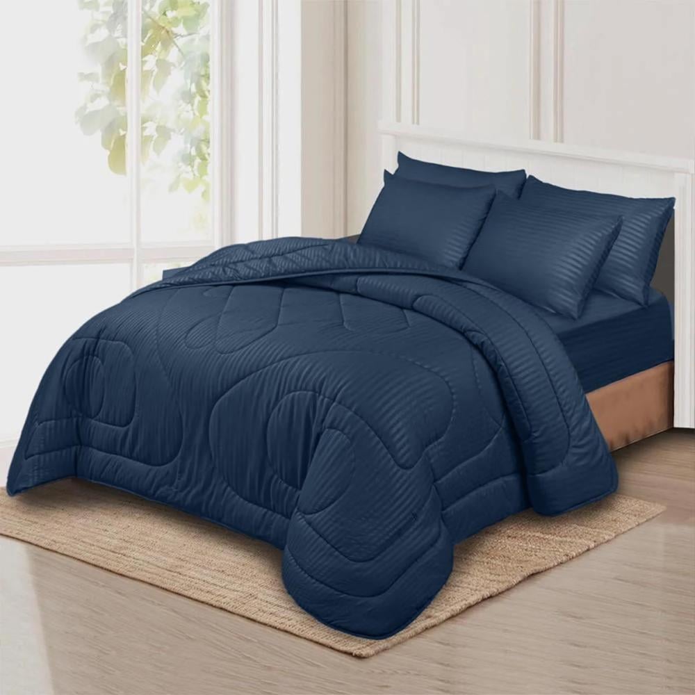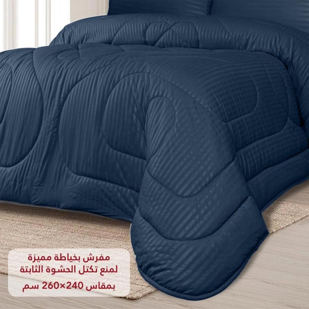 خلّي غرفة نومك تنافس أفخم الفنادق مع مفرش سرير فخم فندقي من تيري باللون الكحلي الأنيق. هالطقم يعطيك فخامة وراحة الفنادق الخمس نجوم وأنت في بيتك، بتصميمه المقلم الكلاسيكي ولمعانه الراقي اللي يضيف لمسة من الأناقة لسريرك. مصنوع من مايكروفايبر فاخر يحاكي القطن الطبيعي ويجي بحشوة ثابتة توفر لك دفء مثالي ونوم هني.